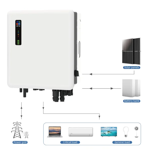 Měnič HF-HL6K-P1EU je vybaven inteligentním systémem řízení toku energie, který automaticky rozhoduje o tom, zda energii poslat do spotřebičů, akumulovat do baterií, nebo dodávat do distribuční sítě. Díky dvěma nezávislým MPPT trackerům dosahuje maximálního výkonu i při částečném zastínění nebo odlišné orientaci panelů. Podpora baterií s napětím 45 – 58 V DC umožňuje přímé připojení moderních LiFePO₄ úložišť.Technické parametry